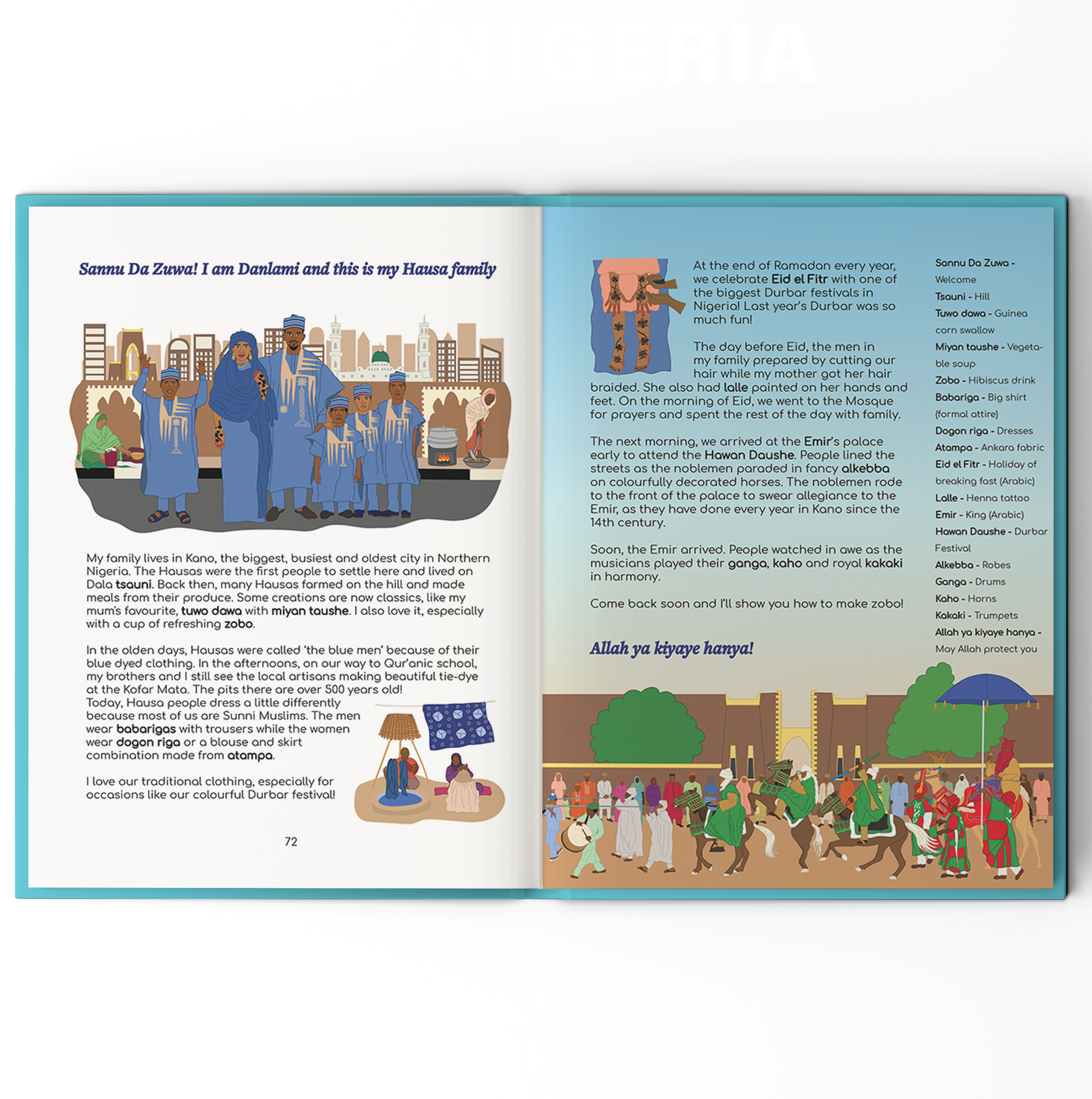 Each child tells you where they live in Nigeria, the environment of their town or city, traditional occupation, and the customs of their people. They will also explain different aspects of their culture such as history, food, clothing, festivals, music, dance, and art.